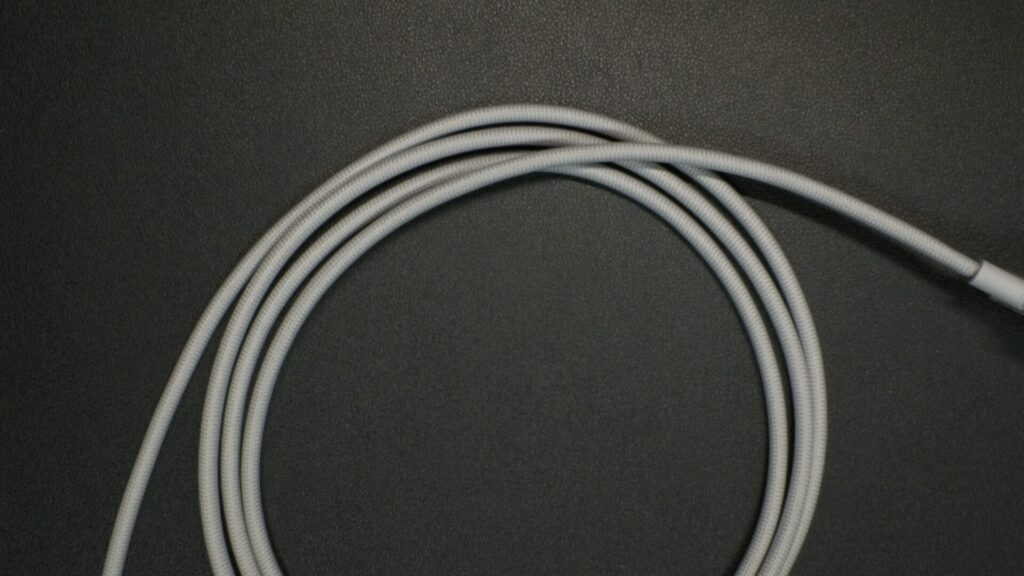 硬くて扱いづらい充電ケーブルも多い中、M07は適度な柔軟性があり、デスク周りでもストレスなく使えます。