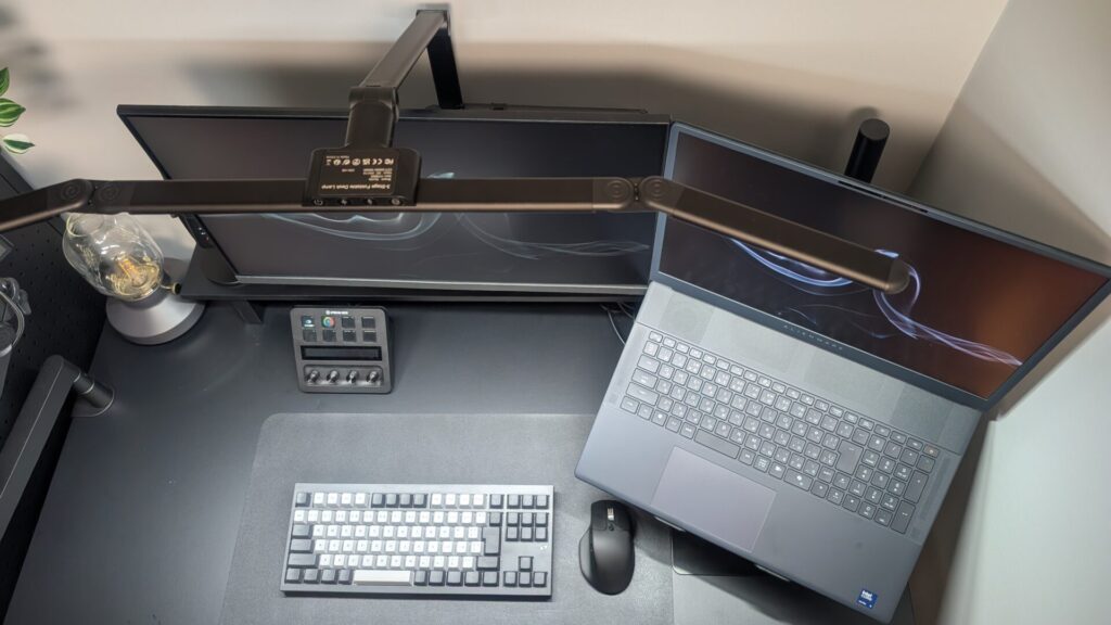 複数のディスプレイを並べたデスクでも、手元全体をムラなく照らせるのが嬉しいポイントです!