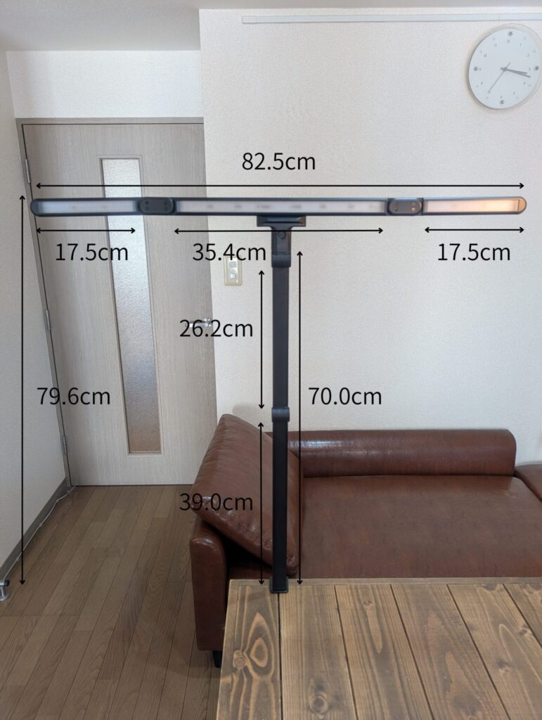 一般的なモニターライトの幅は長いもので50cm前後なのに対し、本製品は最大約80cmまで広がり、照射範囲が180×100cmと非常に広く、デスク全体を明るく照らすことができます。